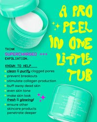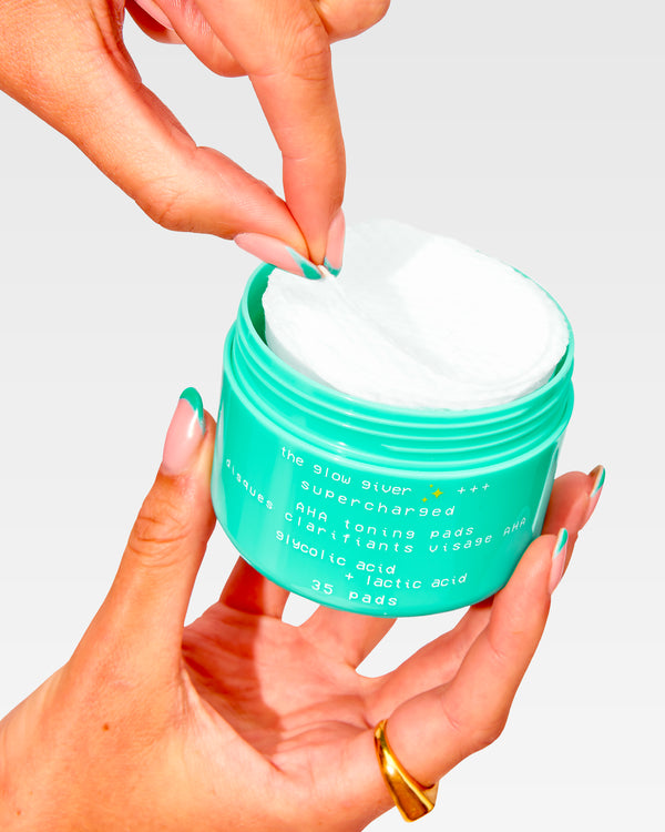 QUOI? des disques tonifiants suralimentés avec de l'acide glycolique + de l'acide lactique, exfoliant la peau pour révéler une peau super radieuse, super lumineuse et super éclatante.