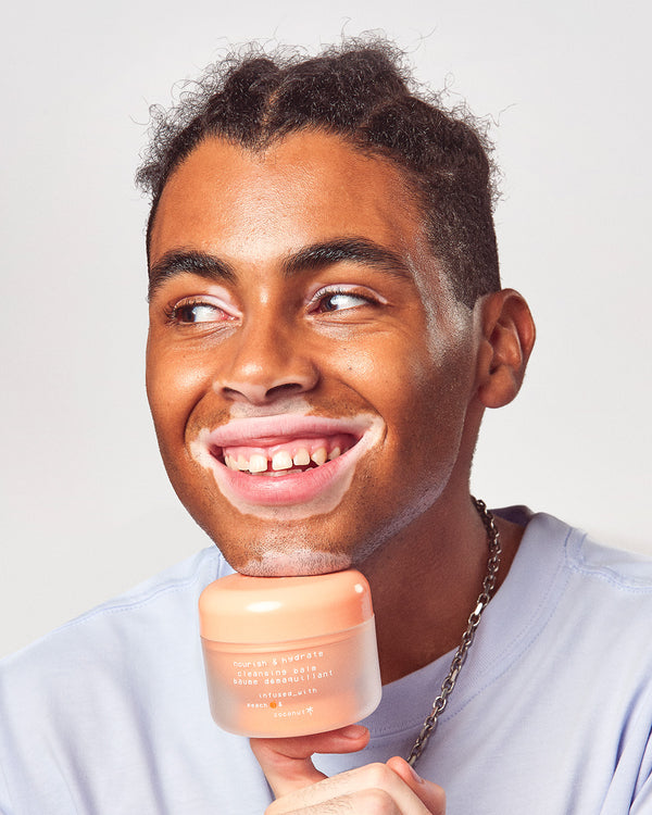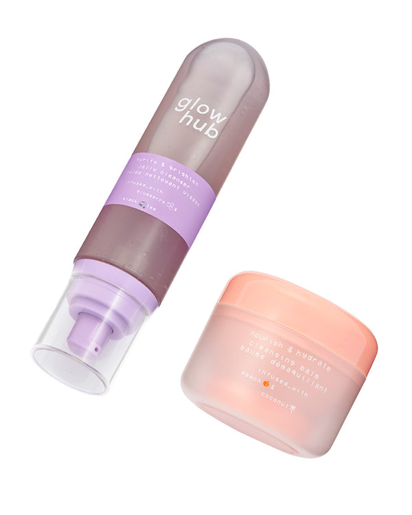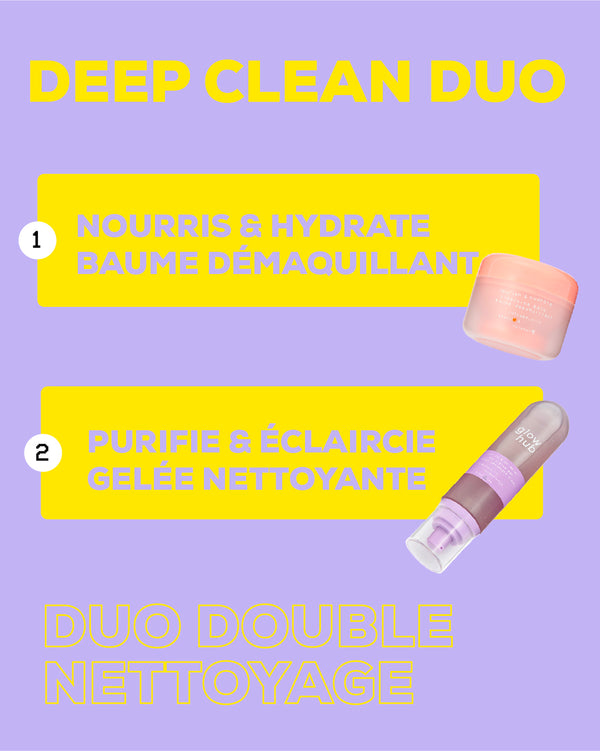 Le double nettoyage permet d'obtenir un nettoyage *sérieusement* profond. Faites fondre le maquillage et la saleté en utilisant le baume nettoyant hyper nourrissant et hydratant à base d'huile. Suivez avec Purifie & Éclaircie Gelée nettoyante pour prendre soin de ce que vous ne pouvez pas toujours voir, doux + riche en antioxydants.