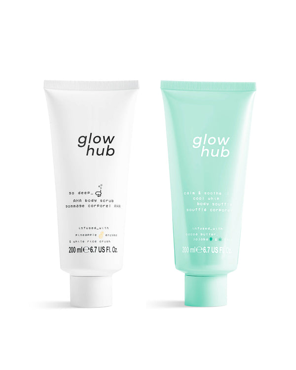 Un duo complet : Calme & Apaise Crème Corps & Go Deep_AHA Gommage Corporel. Une routine en 2 étapes pour resurfacer et lisser, laissant la peau radieuse, soyeuse et éclatante. Pensez à une routine skincare, mais pour le corps.